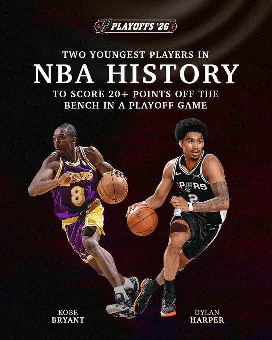 马刺官方发文道:“哈珀成为季后赛历史第二年轻砍下20分+的替补球员,仅次于科比。”