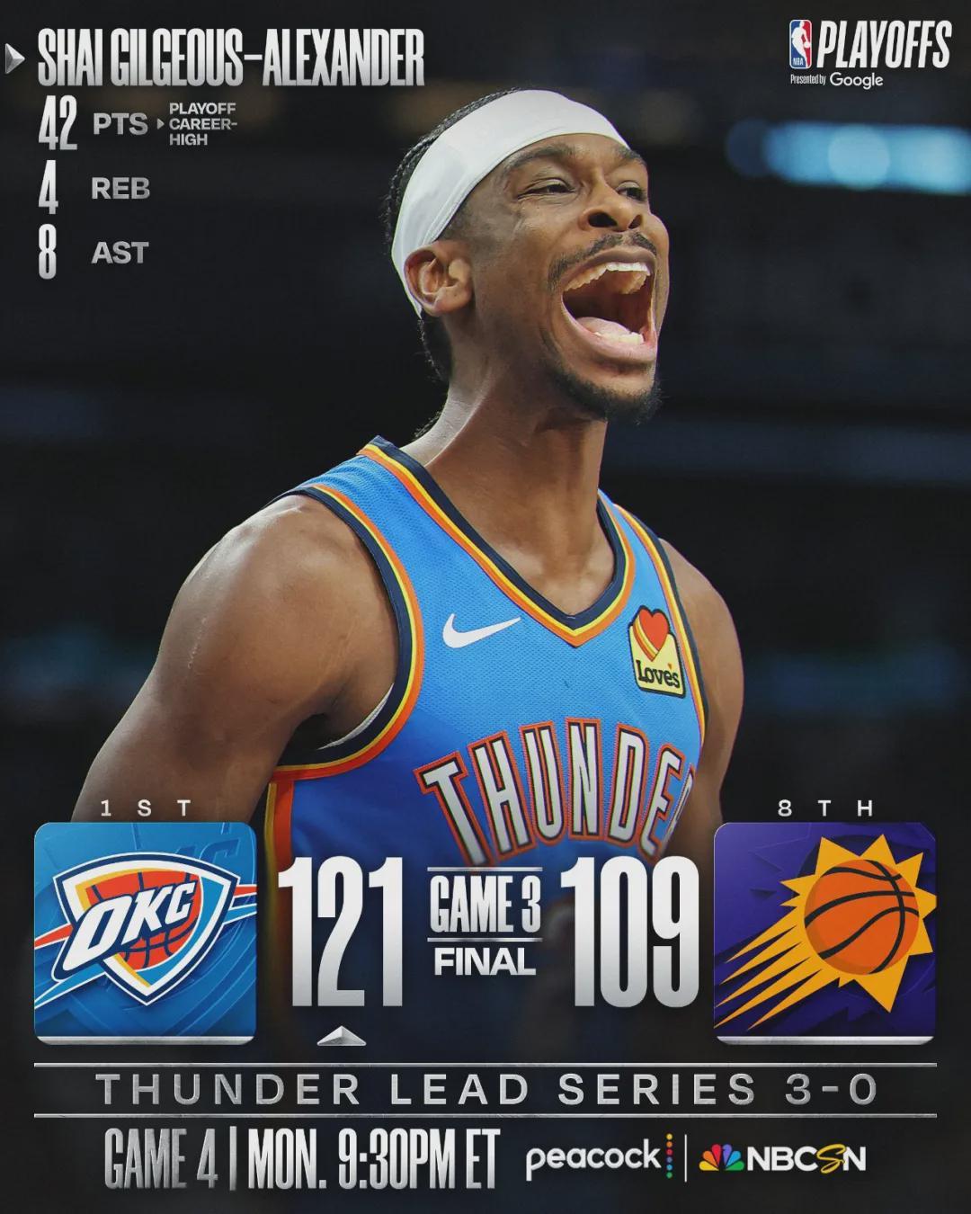 亚历山大接管比赛,此役投篮18中15,三分3中1,罚球12中11,狂轰42分4篮板8助攻1抢断,得分创个人季后赛生涯新高。其中有6个罚球,来自太阳最后的犯规战术。今年季后赛首轮前三场已经全部结束,仅雷霆和湖人取得3-0领先。
